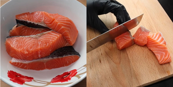 Rửa sạch cá hồi, lau khô và cắt thành từng miếng vừa ăn. Nên cắt thành những miếng nhỏ, dễ cầm nắm cho bé.