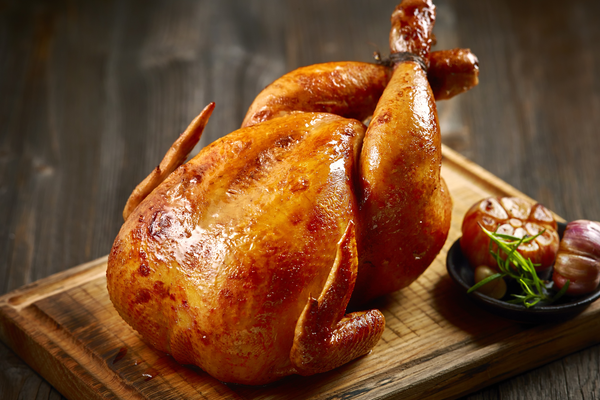 Gợi ý trình bày: Đặt gà trên đĩa lớn, trang trí với rau củ nướng hoặc lá thông tươi để tạo không khí Giáng Sinh.