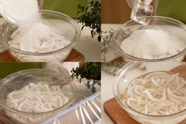 Ướp khoảng 2-3 giờ đến khi đường tan hết và ngấm vào dừa.