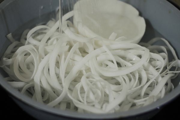 Ngâm dừa trong nước lạnh 3-4 giờ để giảm bớt dầu, sau đó rửa lại bằng nước lạnh và để ráo.