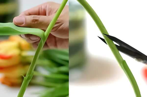- Cắt xéo gốc: Dùng kéo chuyên dụng cắt phần gốc một góc 45 độ dưới dòng nước chảy. Cách này giúp ngăn chặn bọt khí xâm nhập vào thân, giúp hoa hút nước dễ dàng.