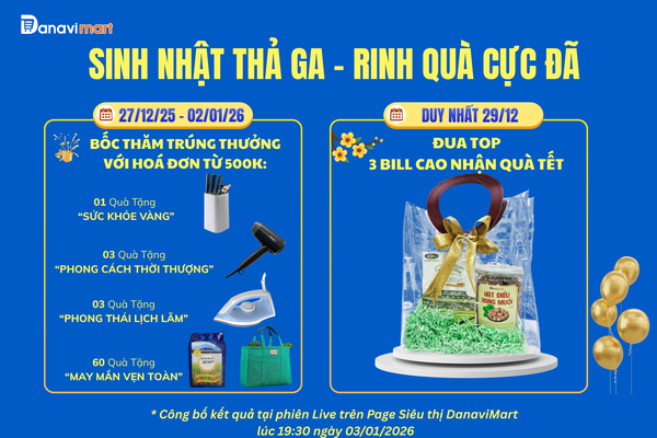 Nhằm tri ân sự tin yêu của Quý khách hàng, DanaviMart triển khai chương trình "Sinh Nhật Thả Ga – Rinh Quà Cực Đã" trên toàn hệ thống. Đây là cơ hội vàng để mua sắm cho dịp Tết Nguyên Đán với mức chi phí tiết kiệm nhất.